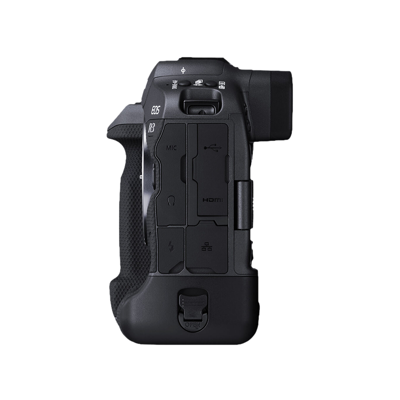 Canon EOS R3 là sản phẩm hướng đến các nhiếp ảnh gia chuyên nghiệp, vì vậy thân máy được tích hợp sẵn một Grip pin gắn liền không thể tháo rời, giúp thời lượng sử dụng máy tăng lên đáng kể.