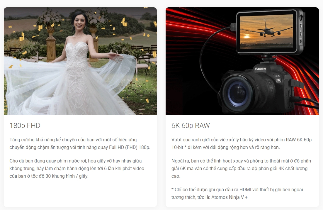 - Ngõ ra 6K RAW HDMI, 4K 60p (6K Oversampling) & FHD 180p