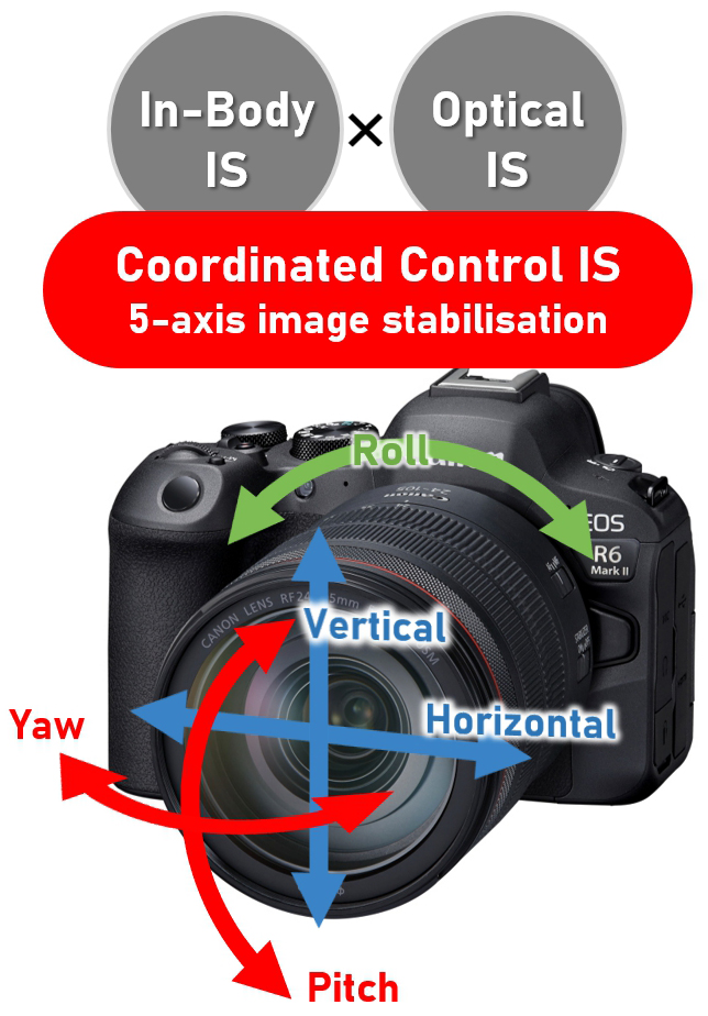 Bộ ổn định hình ảnh (IBIS) được trang bị trong Canon R6 II có thể khắc phục hiện tượng rung máy không mong muốn khi quay bằng tay không lên đến 7 stop. Ngoài ra cũng giúp tăng chất lượng hình ảnh khi quay/chụp trong điều kiện ánh sáng yếu. Movie Digital IS sử dụng các phương pháp ổn định cảm biến và quang học cùng với IS kỹ thuật số để giúp thu được cảnh quay ổn định hơn trong khi chuyển động.